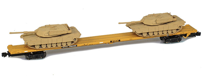 2x M1 loads - sand Single car - auto latch couplers. Six trailer hitches included. Three in the raised position and three in the lowered position. M1s by Andrew Hart of Z-Panzer. They are highly detailed. This is a limited edition release.